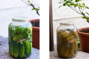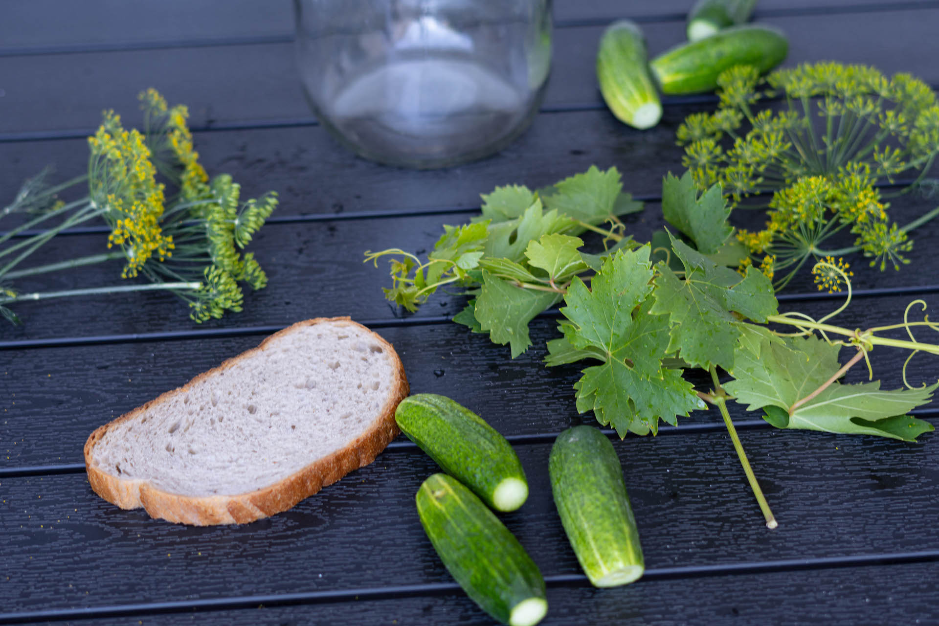 Na dno pohára pridáme tri hroznové listy, kôprový kvet a uhorky, ktoré vedľa seba naukladáme nastojato do pohára. Do stredu pohára, na uhorky, pridáme polovicu kôrky z chleba, kôprový kvet a vložíme ďalšiu vrstvu uhoriek. Na vrch dáme zvyšnú kôrku z chleba, zakryjeme hroznovými listami a zalejeme vlažnou, dobre osolenou vodou. Priklopíme vrchnákom a necháme na slnku alebo teplom mieste kvasiť 4-6 dní.