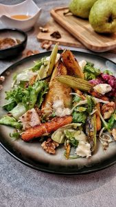 Šalát podávame s grilovanou hruškou, zeleninou, gorgonzolou, vlašskými orechmi, zaliaty medovo - horčicovým dresingom a dozdobíme ho mikrobylinkami.