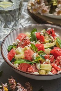 Melón nakrájame na väčšie kocky a uhorku na tenké plátky alebo polmesiačiky. Vložíme do misky.