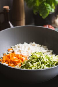 Na olivovom oleji opečieme na jemno nakrájanú cibuľu a cesnak. Pridáme na malé kocky nakrájanú mrkvu, petržlen, nastrúhanú cuketu, zázvor a všetko spolu orestujeme.