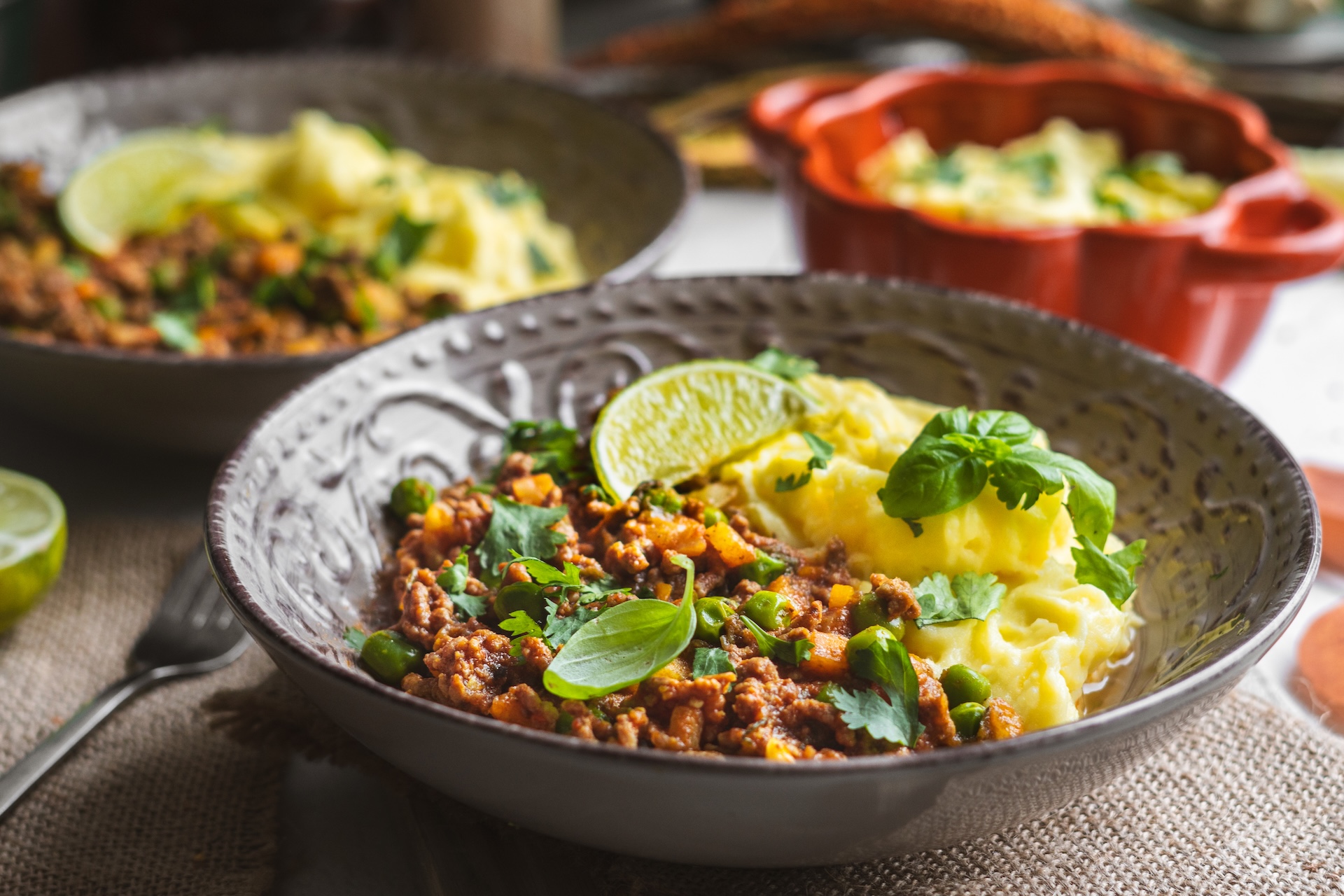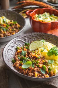 Mleté mäso podávame so zemiakovou kašou posypané čerstvým koriandrom