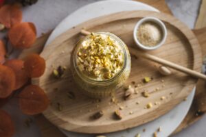 V hrnci zmiešame mlieko, javorový sirup, soľ a pistáciový krém.
