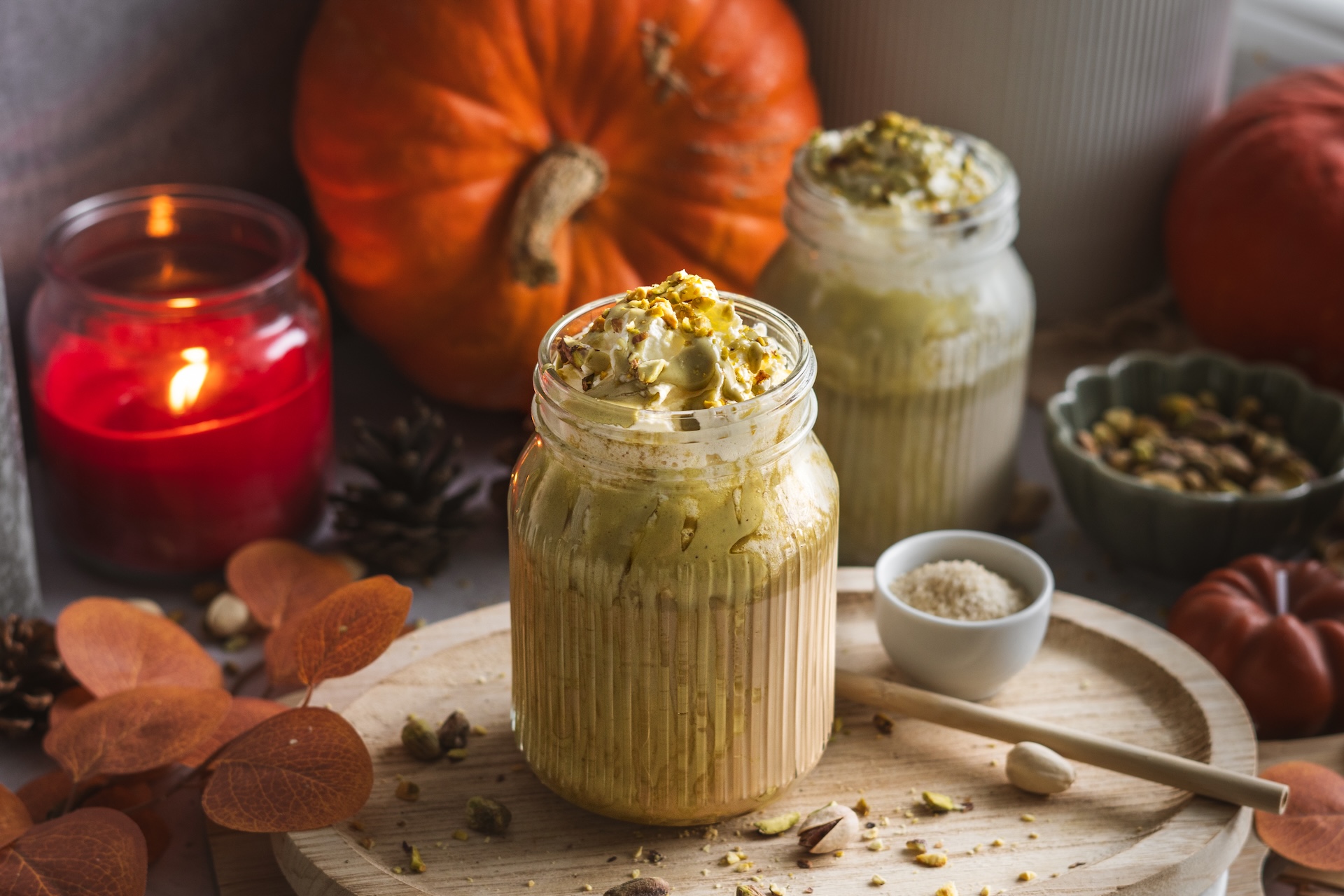 Nalejeme do pohárov, pridáme šľahačku, polejeme pistáciovým krémom a dozdobíme pistáciami.