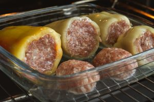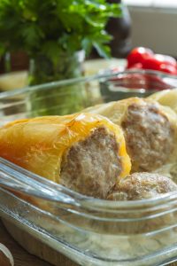 Papriky umyjeme, odrežeme vrchnú časť a vyberieme semienka. Naplníme ich mäsovou zmesou.