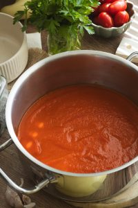 Medzitým si pripravíme omáčku. Na oleji orestujeme cibuľu dosklovita, pridáme paradajkový pretlak, bobkový list, cukor, soľ a korenie. Varíme 10–15 minút, potom vyberieme bobkový list a omáčku premixujeme dohladka. Ak je hustá, prilejeme trochu vývaru.