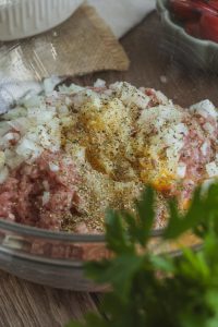 V mise zmiešame mleté mäso, vajce, nadrobno nasekanú cibuľu, prelisovaný cesnak, majorán, soľ a korenie. Rukou vypracujeme kompaktnú zmes. Ak je redšia, pridáme trochu strúhanky (1-2PL).