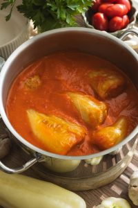 Predpečené papriky vložíme do omáčky a dusíme ešte 15 minút, aby sa chute spojili. Na záver omáčku zjemníme smotanou a krátko prehrejeme.