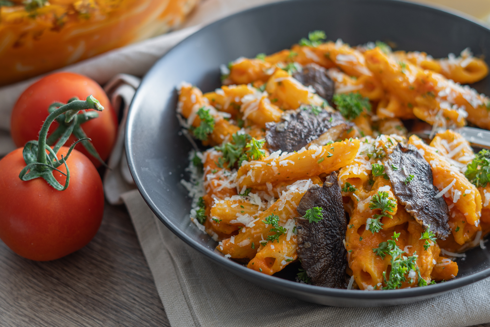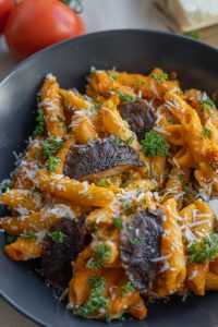 Zeleninu rozmixujeme a dochutíme. Pridáme k uvareným cestovinám a premiešame. Pridáme opečené Shiitake, posypeme parmezánom, nasekanou petržlenovou vňaťou a podávame.