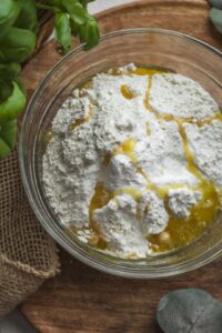 Pridáme múku, prášok do pečiva, soľ a olej a vypracujeme mäkké, nelepivé cesto.