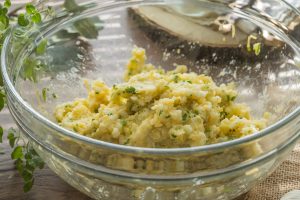 V mise zmiešame uvarenú ryžu, popučané zemiaky, vajce, pretlačený cesnak, syr a nasekanú petržlenovú vňať. Dochutíme soľou a korením. Všetko dobre premiešame, kým nevznikne kompaktná lepkavá zmes.