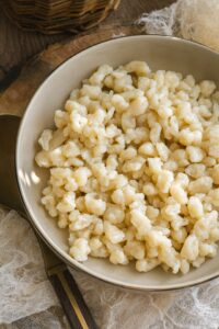 Kým sa huby dusia, pripravíme si halušky. Do misy preosejeme obe múky, pridáme soľ a postupne prilievame vlažnú vodu. Varechou vypracujeme lepkavé cesto. Cesto nemiešame pridlho, aby halušky po uvarení neboli tvrdé. Cesto hádžeme cez haluškovač do vriacej osolenej vody. Keď halušky vyplávajú na povrch, varíme ich ešte 30 sekúnd a okamžite vyberáme. Halušky neoplachujeme.
