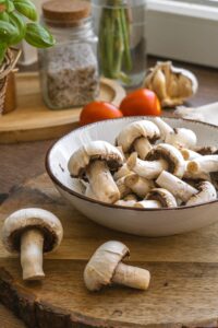 Šampiňóny očistíme a nakrájame na hrubšie plátky. Cibuľu nasekáme nadrobno a cesnak prelisujeme.