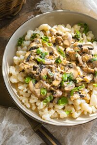 Šampiňónový perkelt podávame s čerstvými haluškami a dozdobíme nasekanou pažítkou alebo petržlenovou vňaťou.
