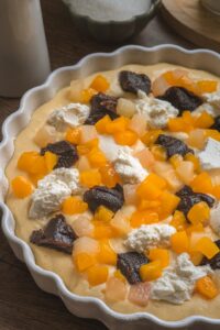Na cesto lyžičkou ukladáme kôpky ricotty a medzi ne pridávame kôpky lekváru. Voľné miesta vyplníme kúskami ovocia.