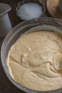 Postupne prisypeme múku zmiešanú s práškom do pečiva a štipkou soli. Jemne premiešame, kým nevznikne hladké, hustejšie cesto.