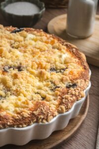 Zo studeného masla, cukru a múky prstami rýchlo vypracujeme sypkú posýpku a rovnomerne ňou zasypeme celý koláč.