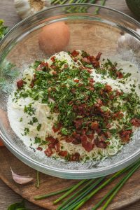 Do misky preosejeme múku, pridáme nastrúhaný syr, prelisovaný cesnak, opečenú slaninku, petržlenovú vňať, soľ a korenie.