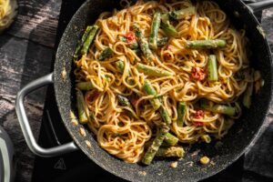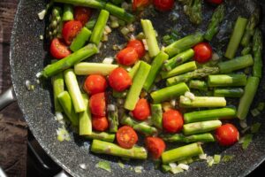 K špargli pridáme nakrájané cherry paradajky, ktoré chvíľku opečieme. Pridáme paradajkový pretlak a zmes premiešame.