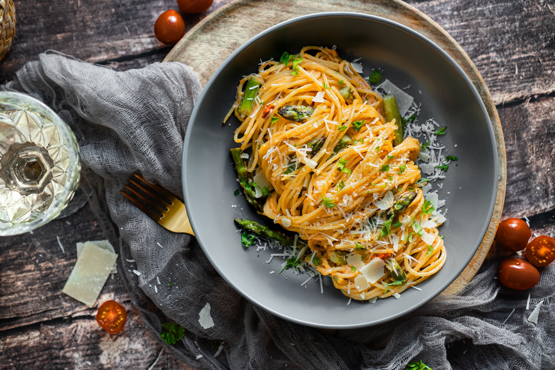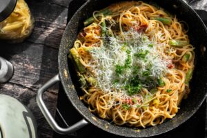 Do omáčky pridáme uvarené špagety a premiešame. Posypeme parmezánom, pridáme nasekanú petežlenovú vňať a podávame.