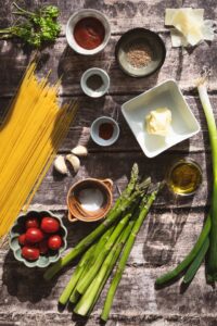 Zelenú špargľu očistíme a nakrájame. Pridáme ju k cibuli a cesnaku a restujeme asi 5 minút.