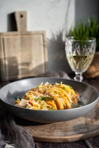 Prilejeme smotanu, ktorú ochutíme soľou, korením, mletou červenou paprikou a muškátovým orieškom. Premiešame a necháme zredukovať. Do omáčky pridáme vodu z uvarených špagiet, aby bola omáčka dostatočne hustá. Podľa potreby ju dochutíme soľou a korením.