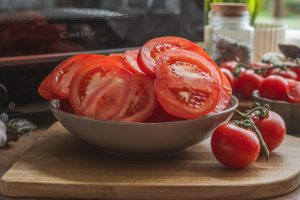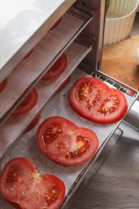 Paradajky nakrájame na hrubšie plátky (asi 1 cm). Ak majú výrazne tuhý stred (jadrovník), môžeme ho pred krájaním vyrezať. Plátky osušíme papierovou kuchynskou utierkou a uložíme na tácky sušičky, ideálne na papier na pečenie, aby sa neprilepili.