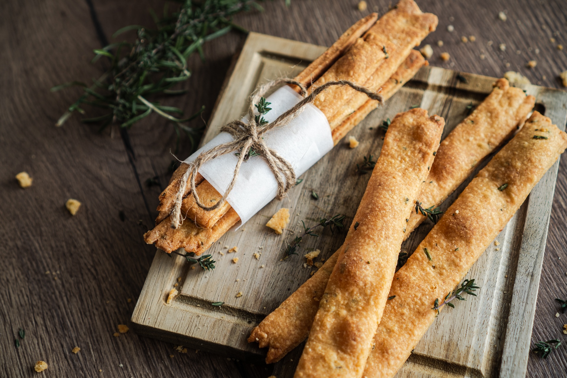 Syr nastrúhame na jemnom strúhadle a pridáme do misky. Prisypeme múku, pridáme mletú červenú papriku, soľ, nasekaný tymian a rozmarín a zmäknuté maslo. Všetko spolu rukou vymiešame.