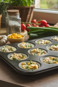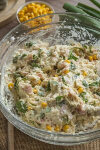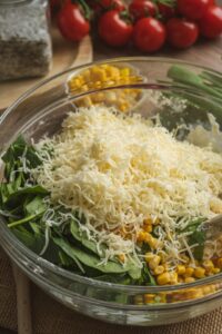 Šunku a čerstvý špenát nakrájame nadrobno, syr nastrúhame. Všetko spolu s kukuricou vmiešame do cesta.