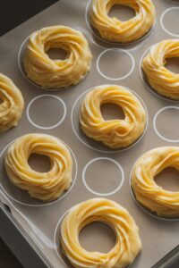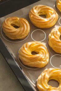 Cesto preložíme do cukrárskeho vrecka s ozdobnou špičkou a na plech vystlaný papierom na pečenie nastriekame venčeky v dvoch vrstvách na seba, aby sa pri pečení pekne otvorili a vytvorili priestor na krém. Medzi jednotlivými venčekmi necháme dostatočné rozostupy, pretože počas pečenia zväčšia objem.
