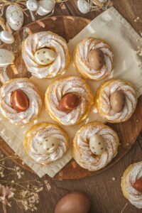 Upečené venčeky prekrojíme, naplníme krémom a posypeme práškovým cukrom. Na sviatočný stôl ich môžete ozdobiť aj malým veľkonočným vajíčkom.
