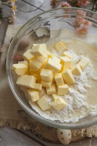 Do misky pridáme hladkú múku, na kocky nakrájané studené maslo, štipku soli a biele víno.