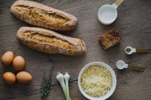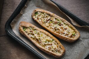 Vajíčkovú zmes vlejeme do bagiet a pečieme pri 180°C približne 30 minút.