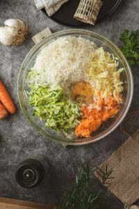 Do misky pridáme najemno nastrúhanú mrkvu, uvarené a nastrúhané zemiaky, cuketu, prelisovaný cesnak, vajce a syr.