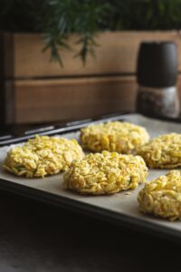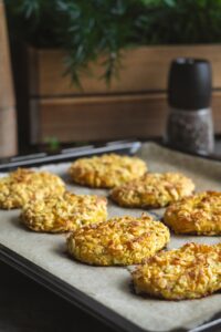 Karbonátky poukladáme na plech vystlaný papierom na pečenie a pokvapkáme ich olivovým olejom. Vyjde nám približne 12 placiek.