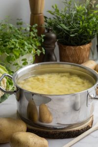 Zemiaky ošúpeme, nakrájame na malé kocky a uvaríme v osolenej vode domäkka. Precedíme ich a ešte teplé pretlačíme cez lis na zemiaky priamo do väčšej misy. K zemiakom pridáme teplé mlieko spolu so zmäknutým maslom. Kašu premiešame vareškou alebo krátko prešľaháme ručným mixérom pri nízkych otáčkach, aby bola krásne hladká a nadýchaná. Nakoniec dochutíme soľou podľa chuti.