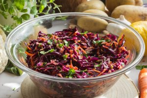 Kapustu nasekáme a mrkvu nastrúhame na hrubom strúhadle, osolíme a necháme 10 minút odstáť. Pridáme nasekanú petržlenovú vňať, prilejeme olej, citrónovú šťavu, pomarančovú šťavu a javorový sirup. Šalát dochutíme soľou. Hotový šalát necháme aspoň 10–15 minút odležať v chladničke, aby sa chute prepojili.
