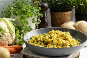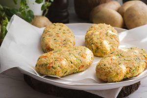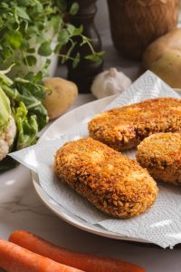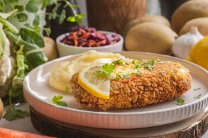 Zeleninový rezeň podávame so zemiakovou kašou a kapustovým šalátom, posypaný nasekanou petržlenovou vňaťou.